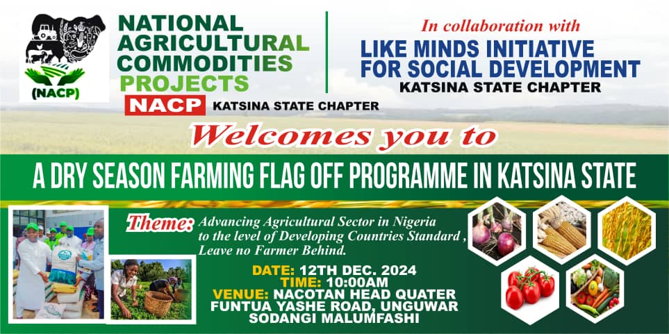 Shirin Bunƙasa Noma na Ƙasa a Jihar Katsina (National Agricultural Commodities Project Katsina State na farin cikin gayyatar ilahirin Manoman Rani na Jihar Katsina, zuwa wajen Bikin Ƙaddamar da Fara Rarraba Kayan Noman Rani na Bana (2024).