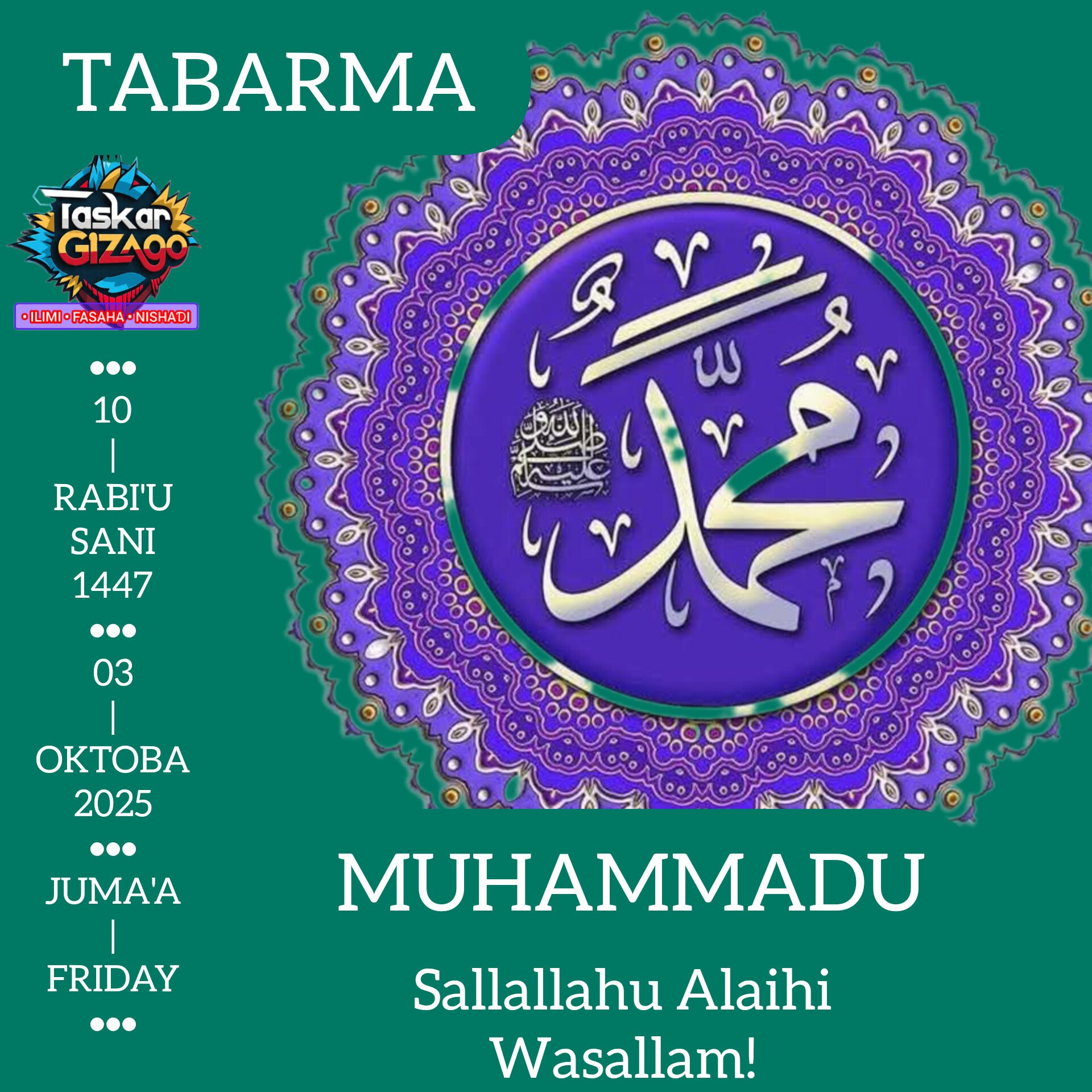 Ya Allah ka daɗa tsira da aminci ga fiyayyen halittarka, Annabi Muhammadu (saw) da ahalinsa da sahabansa da nagartattun bayinka. Allah ka ƙara mana so da ƙaunarsa, ka ƙara mana fahimta da himma wajen kare nartabarsa da ta ahalinsa. Allah ka ba mu ikon bin shiriyarsa. Ya Allah ka sa muna cikin cetonsa a ranar ƙiyama. Amin-Summa-Amin!