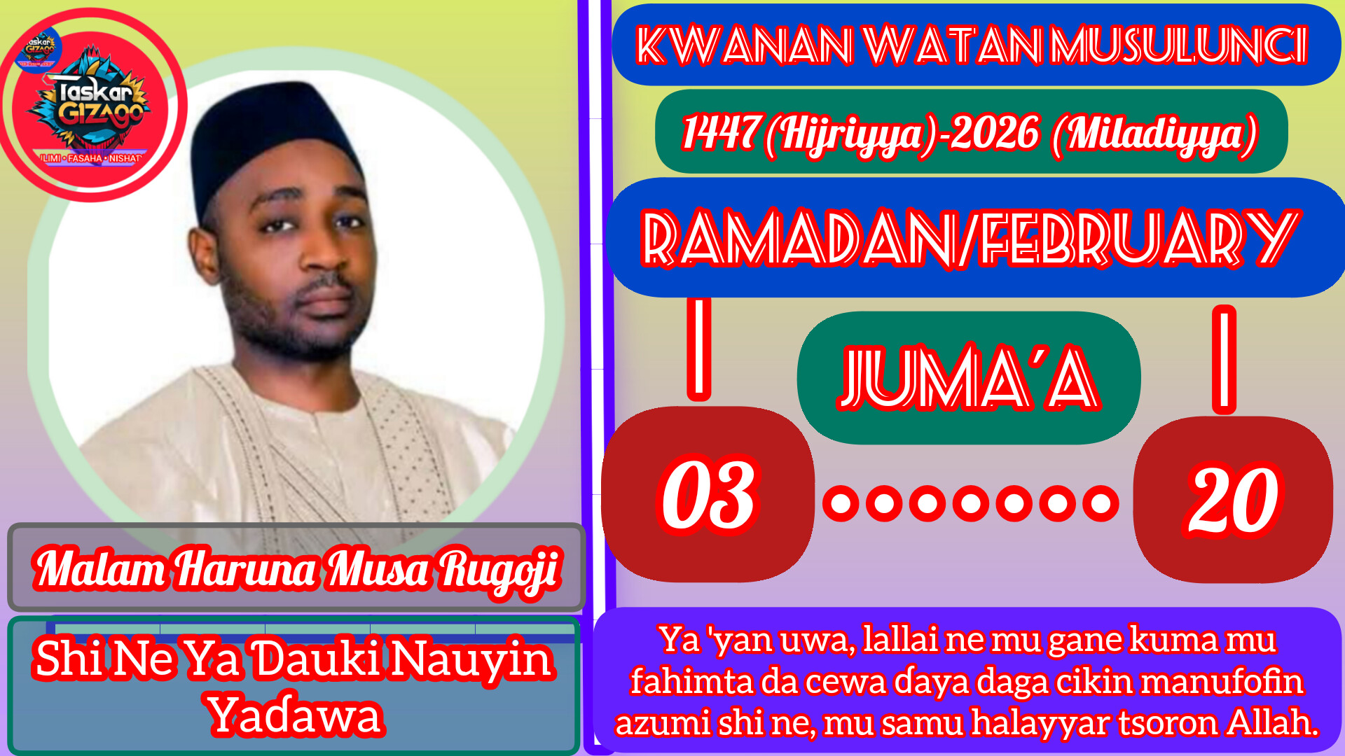 Ya ‘yan uwa, lallai ne mu gane kuma mu fahimta da cewa ɗaya daga cikin manufofin azumi shi ne, mu samu halayyar tsoron Allah. Da tsoron Allah ne za mu ji daɗin rayuwar duniya kuma mu rabauta a lahira.