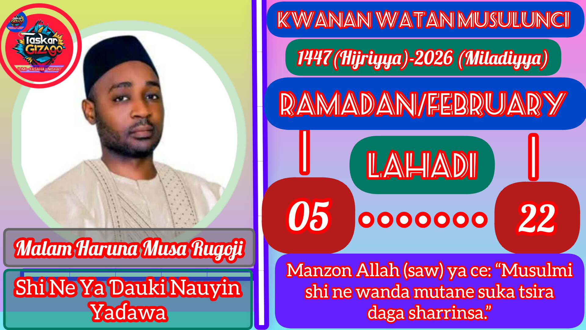 ‘Yan uwa, ina yi maku sallama irin ta Musulunci, Assalamu alaikum warahmatullahi wabarakatuhu. Bayan haka, a yau Allah ya nuna mana rana ta 5 a Ramadan, don haka bari mu ribaci wannan rana da ‘yar nasiha: