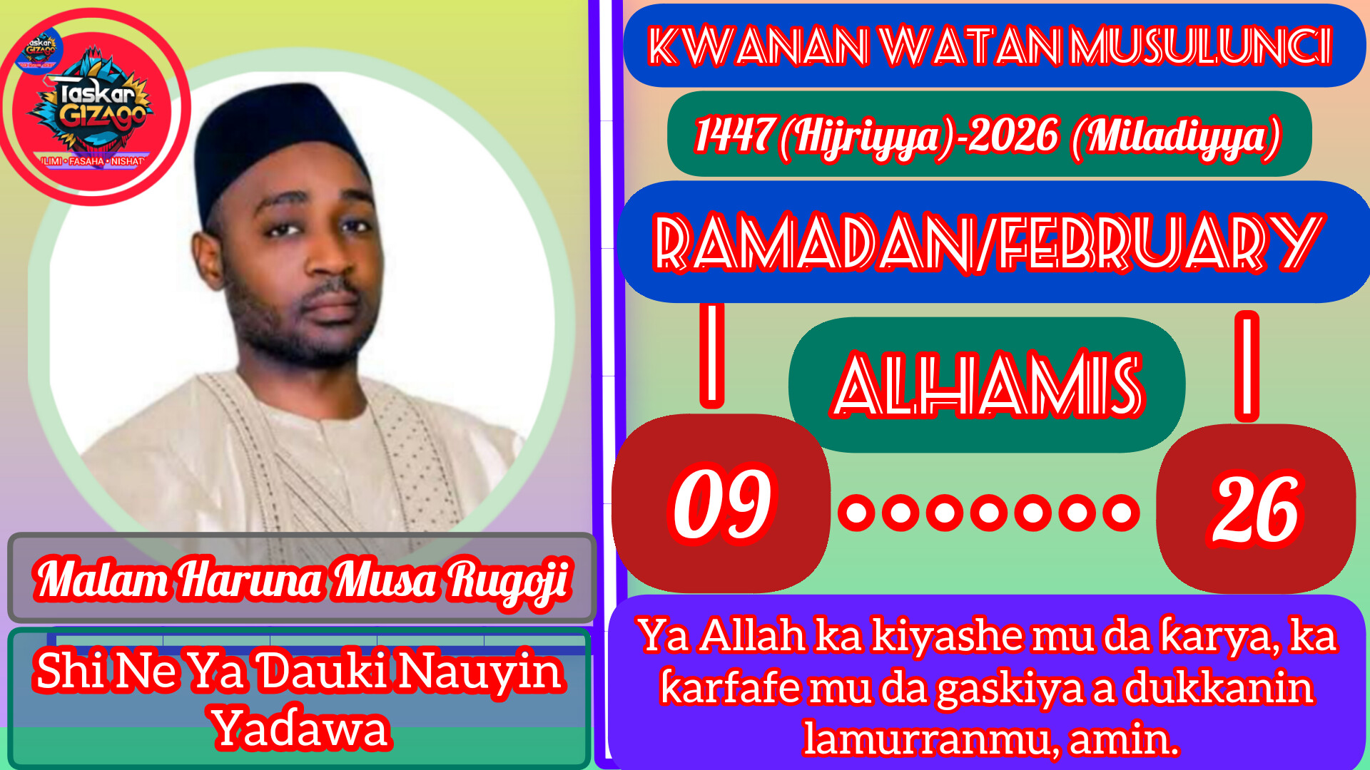 ‘Yan uwa, ina yi maku sallama irin ta Musulunci, Assalamu alaikum warahmatullahi wabarakatuhu. Bayan haka, a yau Alhamis, Allah ya nuna mana rana ta 9 a Ramadan. Yau ma ga ‘yar nasiha: