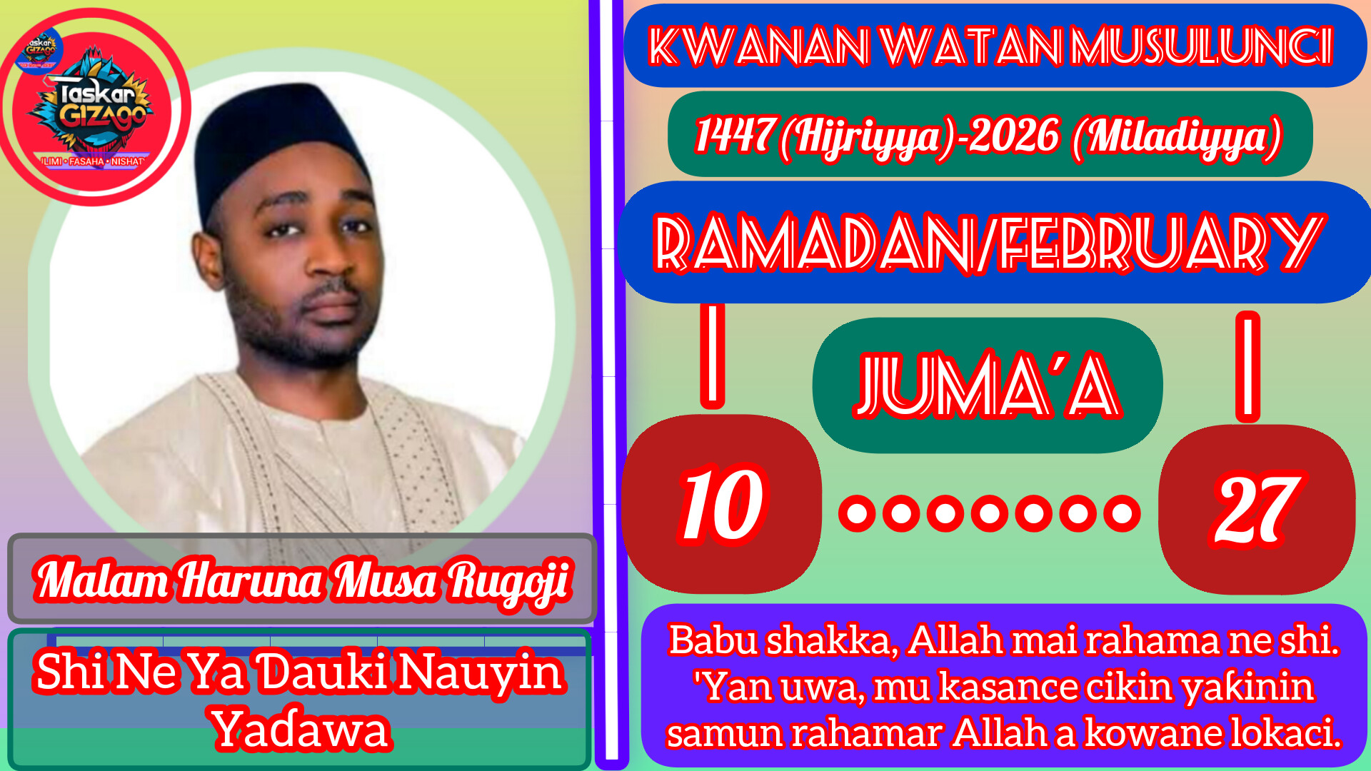 ‘Yan uwa, ina yi maku sallama irin ta Musulunci, Assalamu alaikum warahmatullahi wabarakatuhu. Bayan haka, a yau Juma’a, Allah ya nuna mana rana ta 10 a Ramadan. Yau ma ga ‘yar nasiha: