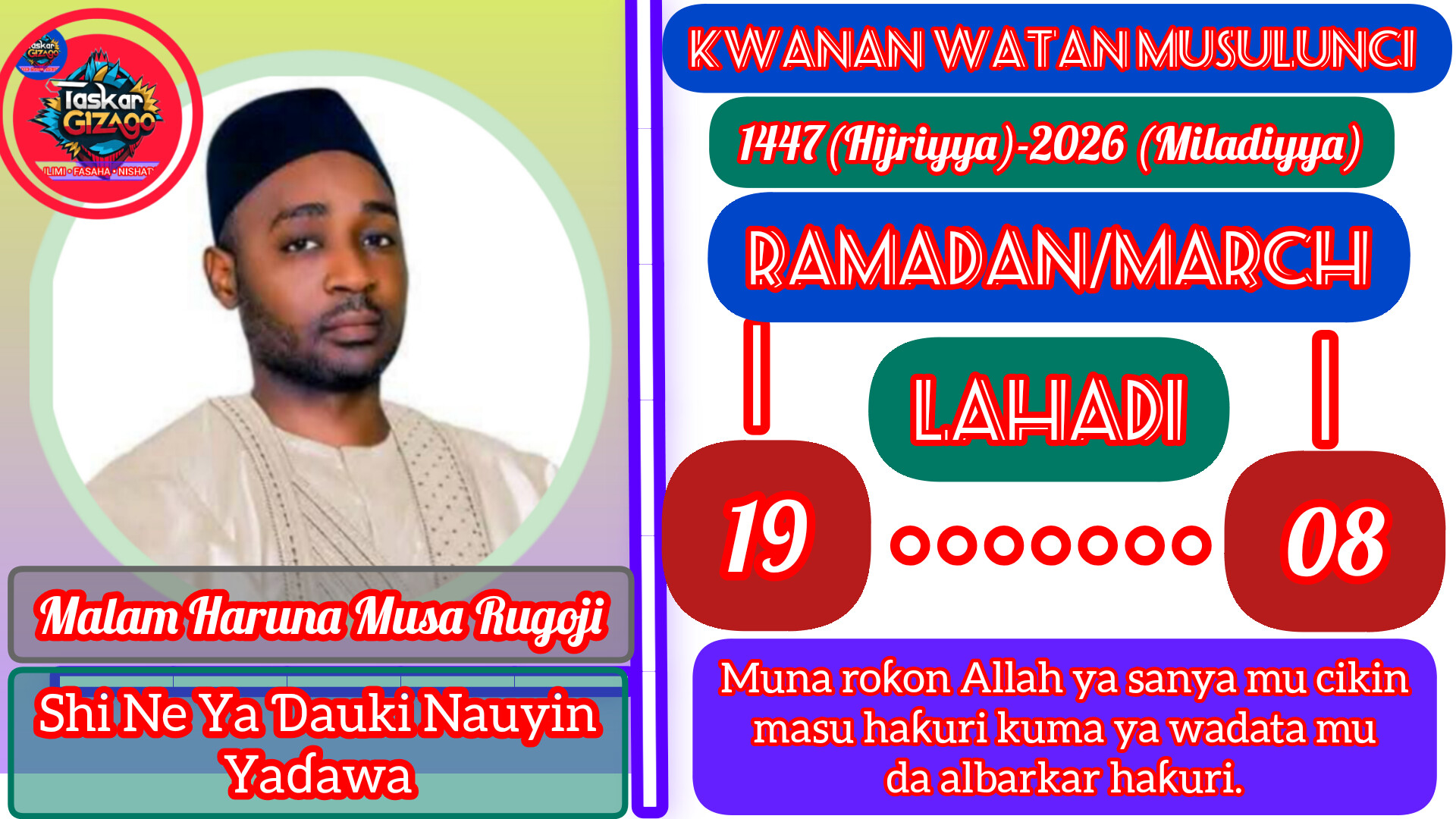 ‘Yan uwa, ina yi maku sallama irin ta Musulunci, Assalamu alaikum warahmatullahi wabarakatuhu. Yau Lahadi, Allah ya nuna mana rana ta 19 a Ramadan. Yau ma ga nasiharmu: