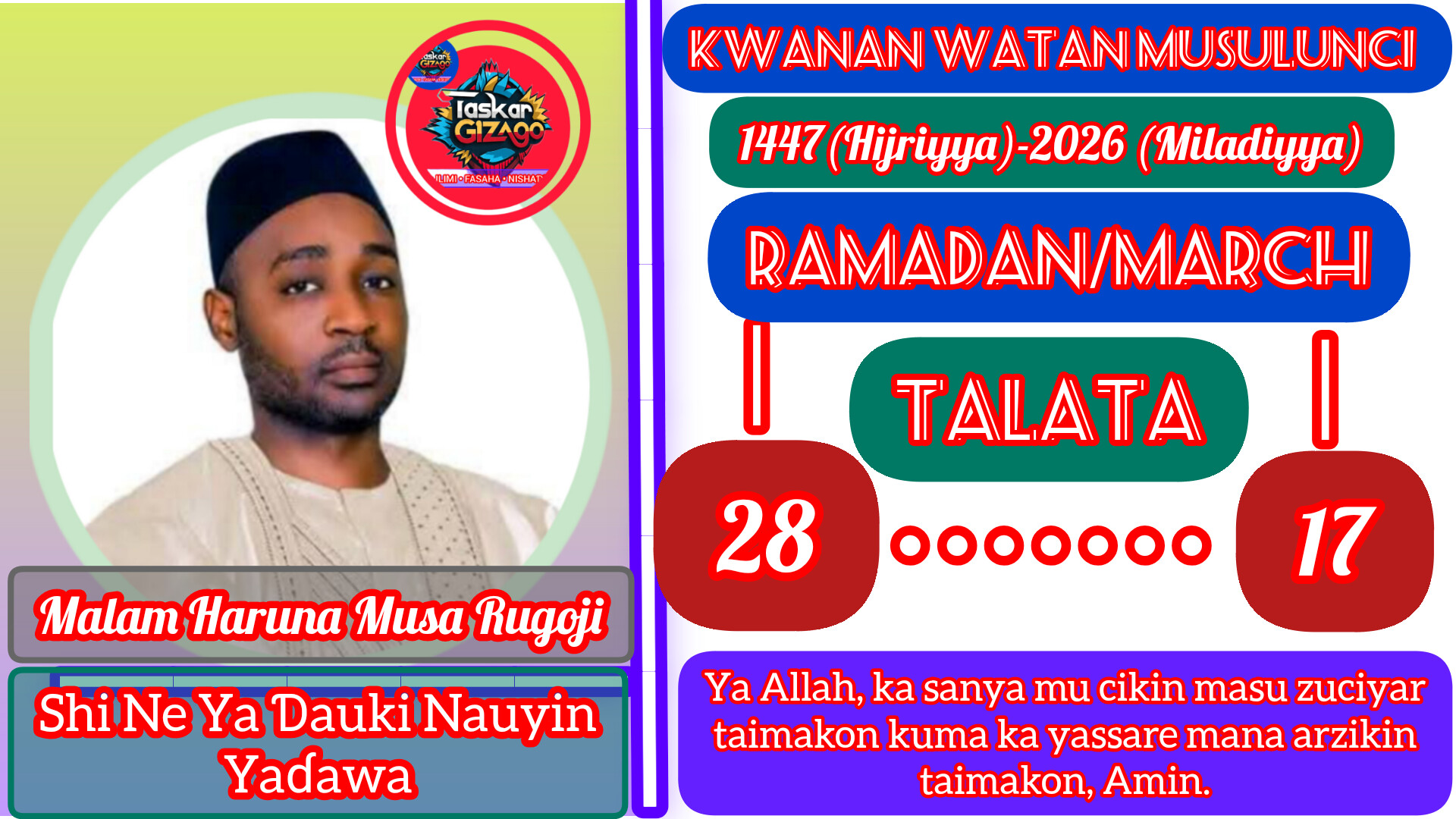 ‘Yan uwa, ina yi maku sallama irin ta Musulunci, Assalamu alaikum warahmatullahi wabarakatuhu. Yau Talata, Allah ya nuna mana rana ta 28 a Ramadan. Yau ma ga nasiharmu: