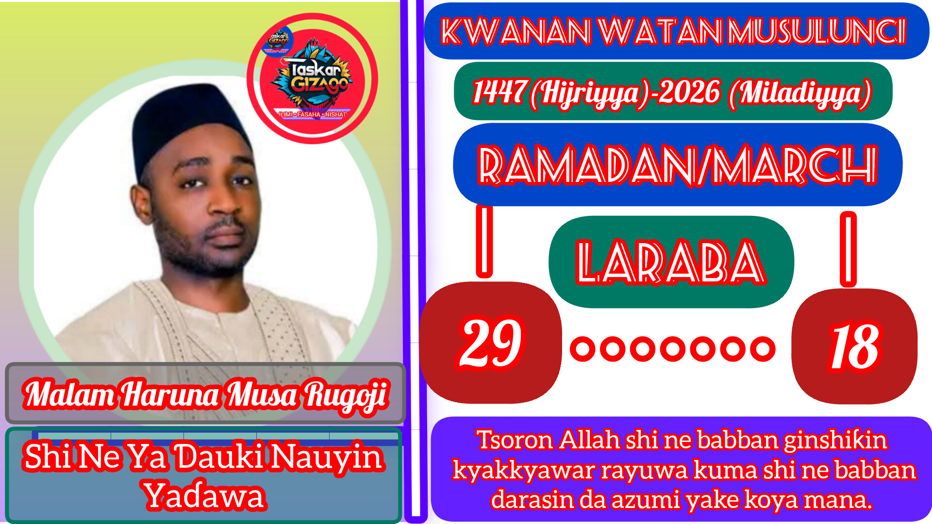 ‘Yan uwa, ina yi maku sallama irin ta Musulunci, Assalamu alaikum warahmatullahi wabarakatuhu. Yau Laraba, Allah ya nuna mana rana ta 29 a Ramadan. Yau ma ga nasiharmu: