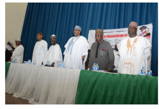 Hagu Zuwa Dama: Manjo-Janar Paul C. Tarfa (mai ritaya) CON, Shugaban Hukumar Bunƙasa Yankin Arewa Maso Gabas (Shugaban Taro); Janar Yakubu Gowon, GCFR, tsohon Shugaban Ƙasar Najeriya (Uban Taro); Umar Usman Kadafur, Mataimakin Gwamnan Jihar Borno (Wakilin Gwamnan Jihar Borno); Farfesa Abdullahi Y. Shehu, marubucin littafin Boko Haram Da Sauran Kalubalen Tsaro A Najeriya (Boko Haram and other Security Challenges in Nigeria); Dokta Bukar Usman, mai sharhi kan littafin “Boko Haram Da Sauran Ƙalubalen Tsaro A Najeriya” (Boko Haram and other Security Challenges in Nigeria); Dokta Aliyu Modibbo Umar, Mataimaki Na Musamman ga Mataimakin Shugaban Ƙasa ta Ɓangaren Ayyuka (Wakilin Mataimakin Shugaban Ƙasa (Babban Baƙo na Musamman).